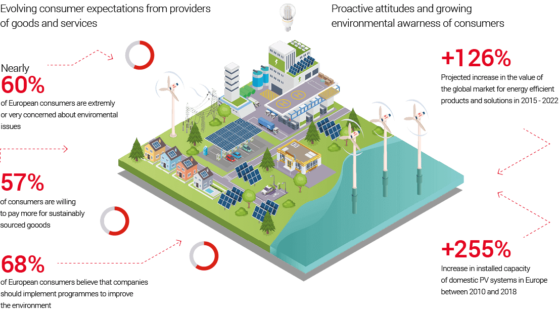 Investment in renewable energy sources is driven by the growing environmental awareness of the general public, reflected in new, ambitious climate objectives set in new agreements (Paris Agreement, New Green Deal, RED II in the EU, restrictions on the production of disposable packaging) aimed at driving progress towards energy transition. Currently, the countries that have made a commitment to achieve net zero carbon footprint by 2050–2060 (China, the European Union, Canada, Japan, South Korea), including the US, which is likely to make a similar declaration, account for 65% of global emissions. The list of oil and gas companies making this commitment is also growing. Finally, we are witnessing change in customer expectations, including preference for digital distribution channels and tailored product offering with information on carbon footprint.