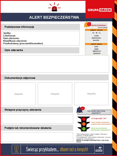 Ponadto wydawane są dla przedstawicieli Koncernu m.in. Raport Bezpieczeństwa Osobistego, Procesowego i Pożarowego Grupy ORLEN, w których znajduje się szczegółowa analiza wypadków przy pracy kontraktorów wraz z informacjami o podjętych działaniach zaradczych.